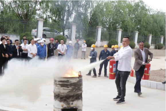 在汽机房前空地上,安环部示范讲解了消防器械的正确使用方法及技巧,并组织员工轮流进行火灾扑救模拟训练。
