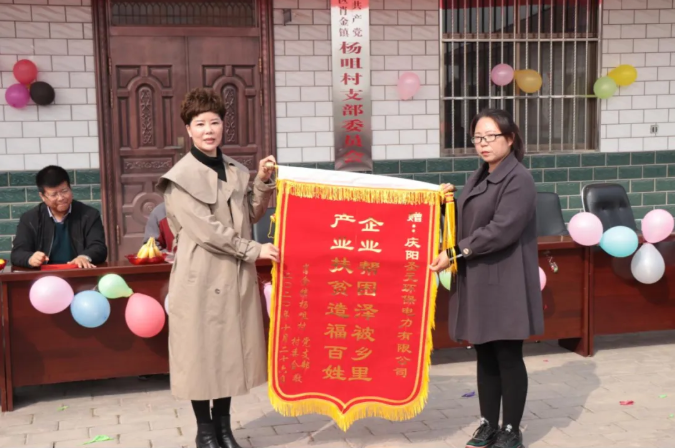 杨咀村、胡同村党支部先后派出代表向庆阳太阳成集团tyc33455cc送上锦旗和荣誉牌,充分肯定庆阳太阳成集团tyc33455cc在公益事业、产业扶贫等方面造福百姓的举措。