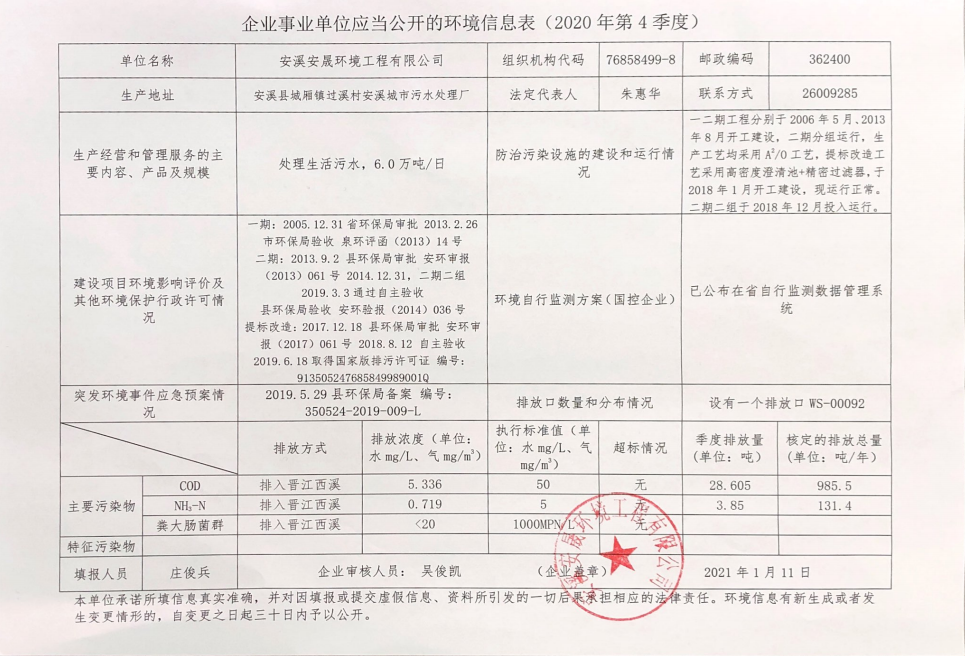 安溪厂2020年第四季度 企事业单位应当公开的环境信息表