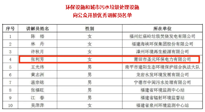 近日,福建省生态环境厅、福建省住房和城乡建设厅公布环保设施和城市污水垃圾处理设施向公众开放优秀案例、优秀讲解员入选名单 。“泉州市宝洲污水处理厂向公众开放”、“莆田太阳成集团tyc33455cc社区共享中心”被评为环保设施向公众开放优秀案例,莆田太阳成集团tyc33455cc张利芳被评为环保设施向公众开放优秀讲解员。