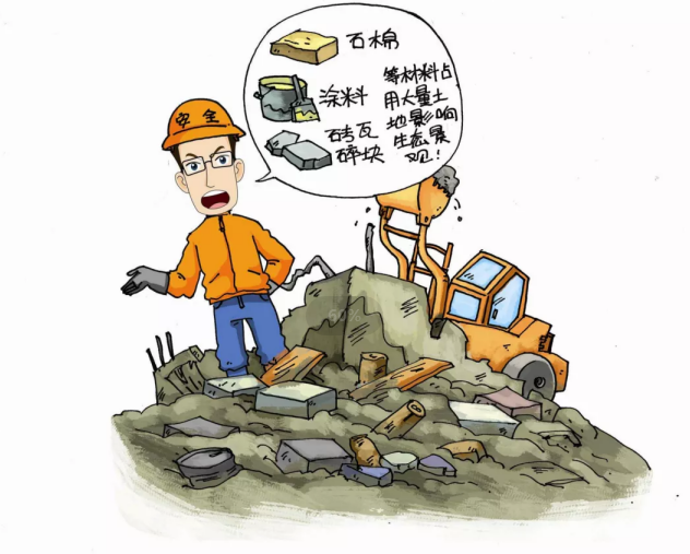 建筑废物指的是在人们从事拆迁、建设、装修、修缮等建筑业的生产活动中产生的渣土、废旧混凝土、废旧砖石及其他废物的统称。我国在2011年可推算的建筑废物产生总量在21亿至28亿吨之间。建筑废物的堆放具有随意性,容易坍塌,有很大的安全隐患;建筑废物因为原建筑中一些难以拆除或者遗留在原建筑中的有毒有害物品,而具有潜在的环境风险,比如石棉、涂料、油漆等。建筑垃圾量大,占用大量土地,影响生态景观。