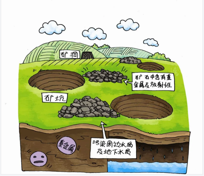 矿山固体废物是在采矿和选矿过程中产生的没有工业价值的矿物,例如尾矿、废石以及煤矸石等。这些废物通常都含有重金属等污染物。另外,还会有选矿过程加入的一些表面活性剂、酸或者碱等危害环境的成分。有些矿山固体废物还有一定的放射性。它们通常会堆在矿场附近,既侵占良田,又在长期的风化及雨水的淋洗下,使周边的地下水质变坏,特别是酸性水或含有重金属的污水,污染周边环境。