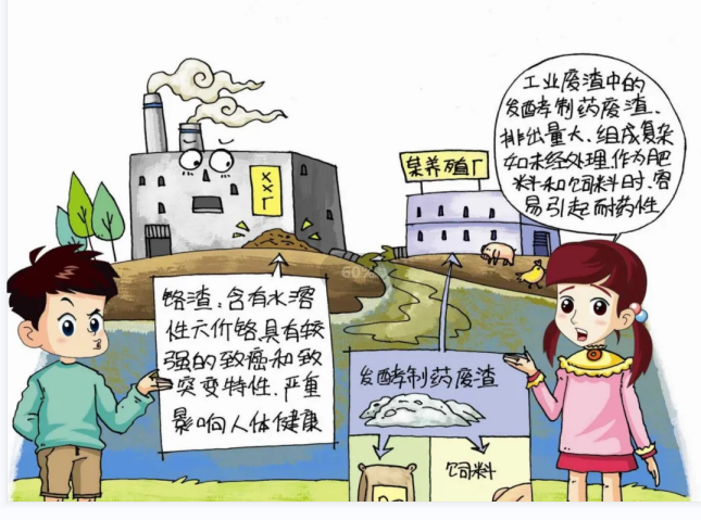 例如,工业废渣中的铬渣,含有水溶性六价铬具有较强的致癌和致突变特性。铬渣露天堆放,受雨雪淋浸,所含的六价铬就会被溶出渗入地下水或进入河流、湖泊中污染环境,容易造成更大规模的危害。再如,工业废渣中的发酵制药废渣,排出量大,组成复杂,涉及的有毒有害物质种类多,在未经处理的情况下,会对环境造成新的污染。特别是当发酵制药废渣作为动物饲料和肥料时,容易引起耐药性问题,存在各种安全隐患。