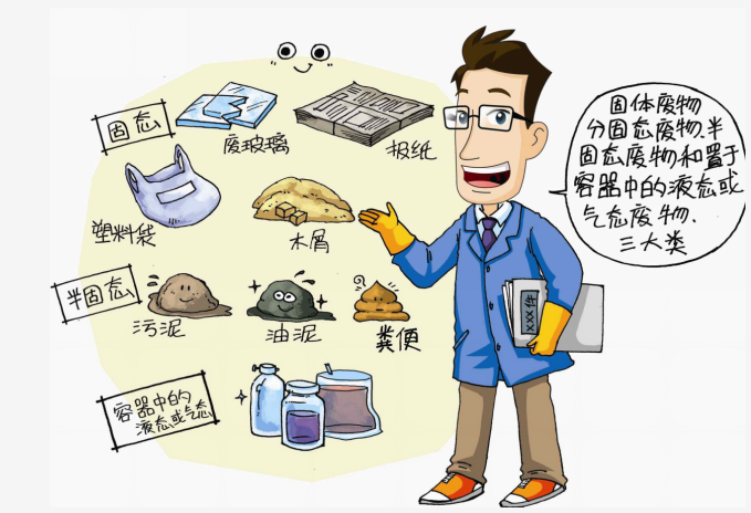 固态废物,如废玻璃瓶、报纸、塑料袋、木屑等;半固态废物,如污泥、油泥、粪便等;置于容器中的液态或气态废物,如废酸、废油、废有机溶剂等。