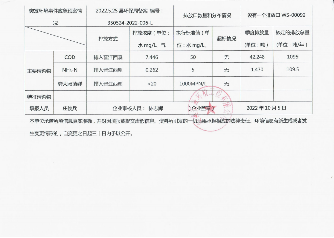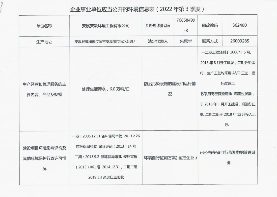安溪城市污水处理厂2022年第3季度环境信息公开