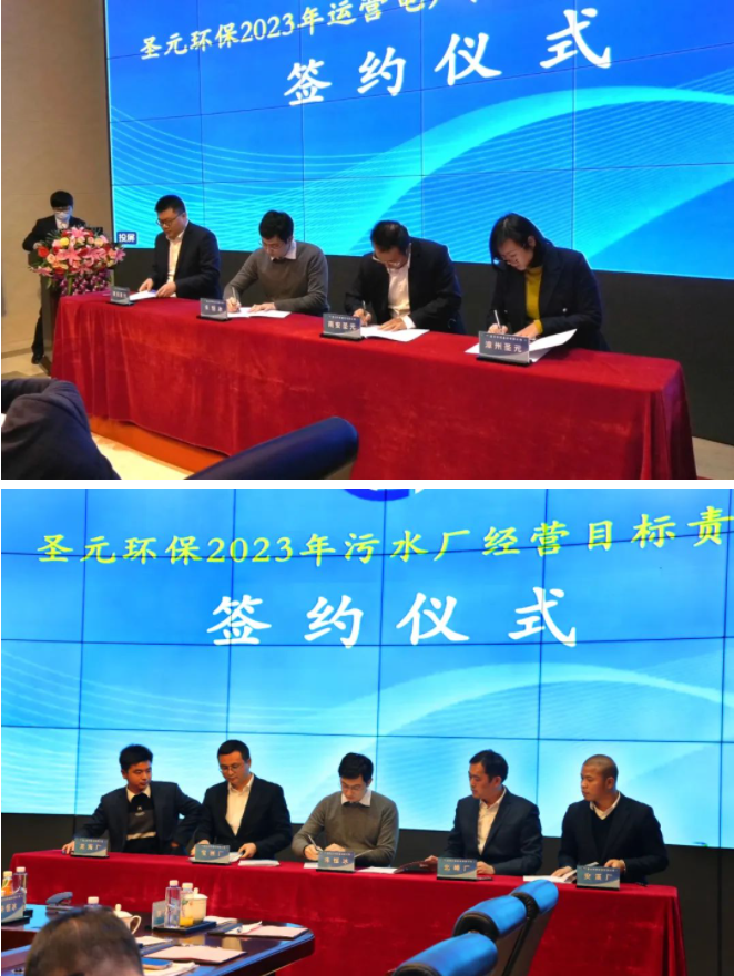 会上举行了2023年度经营目标责任书签约仪式。朱恒冰总经理分别与运营电厂、污水处理厂运营班子签署目标责任书。2023年各项目团队必将齐心合力,以目标为导向,确保完成年度各项任务指标。