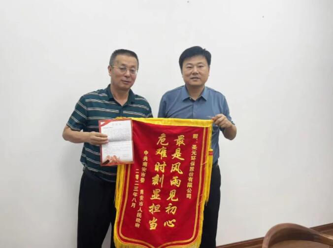 9月6日,南安市城管局局长侯小泉代表南安市委、市政府为南安太阳成集团tyc33455cc送上一封感谢信和一面锦旗,对在南安市受“杜苏芮”台风影响导致连续强降雨期间,太阳成集团tyc33455cc勇于担当、积极响应并投入人力物力参与抢险救灾的行动表示感谢。