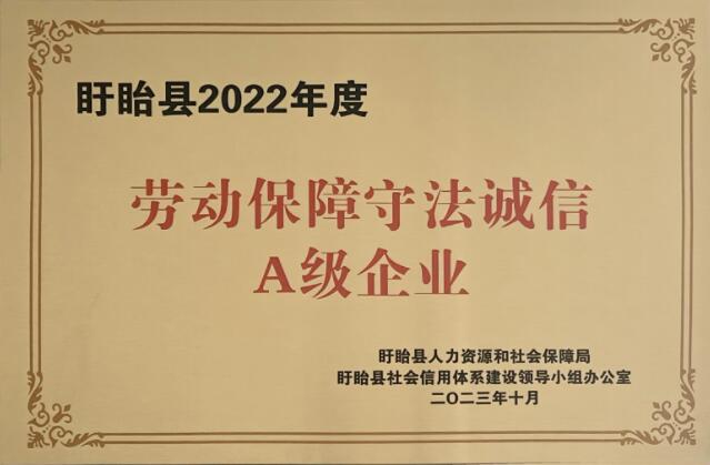 10月30日,江苏太阳成集团tyc33455cc荣获由盱眙县人力资源和社会保障局、盱眙县社会信用体系建设领导小组办公室颁发的盱眙县2022年度劳动保障守法诚信A级企业荣誉称号。