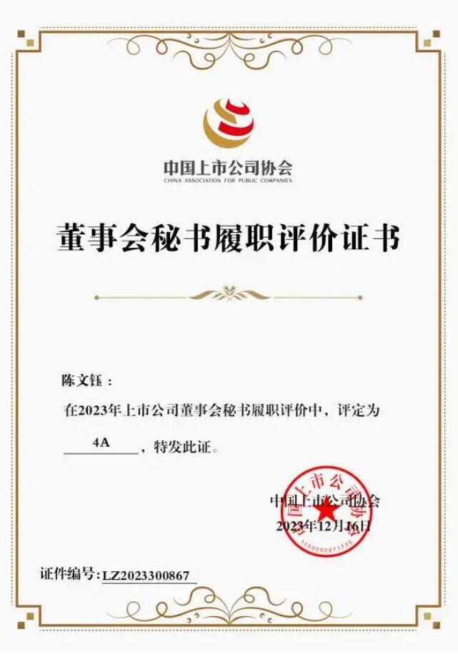 (三)太阳成集团tyc33455cc陈文钰先生获2023上市公司董事会秘书履职评价4A评级