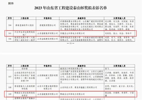 2023年12月27日,山东省住房和城乡建设厅公示2023年工程建设泰山杯获奖名单,经企业申报、逐级推荐、现场复查和集中评选,由集团施工的天长市生活垃圾焚烧发电厂项目、鄄城县生活垃圾焚烧发电项目获泰山杯奖。