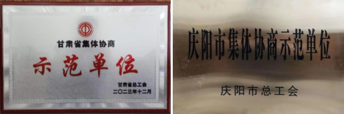近日,庆阳太阳成集团tyc33455cc先后被甘肃省总工会、庆阳市总工会授予“集体协商示范单位”,这是对公司近年来维护职工权益、构建和谐劳动关系、促进经济社会高质量发展等方面工作的肯定和激励。