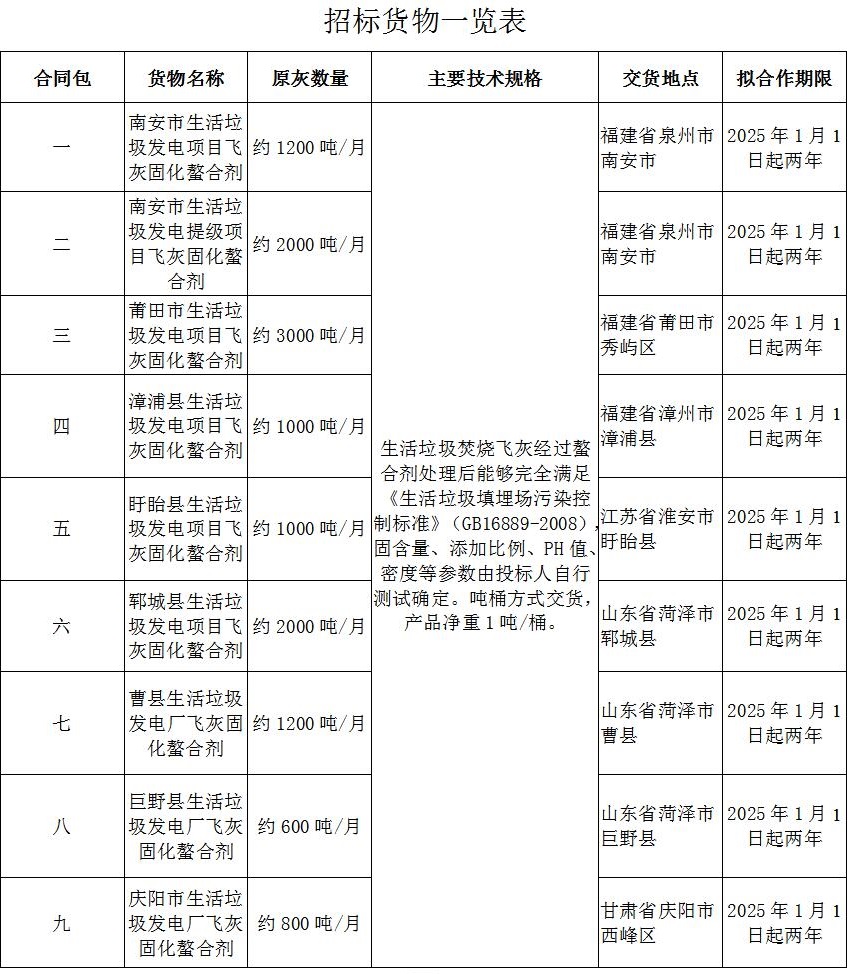 太阳成集团tyc33455cc对南安市生活垃圾焚烧发电厂、南安市生活垃圾焚烧发电厂提级项目、莆田市生活垃圾焚烧发电厂、漳浦县生活垃圾焚烧发电厂、盱眙县生活垃圾焚烧发电厂、郓城县生活垃圾焚烧发电厂、曹县生活垃圾焚烧发电厂、巨野县生活垃圾焚烧发电厂、庆阳市生活垃圾焚烧发电厂飞灰固化螯合剂采购项目的下述货物及服务进行国内公开招标,现欢迎国内合格的投标人前来提交密封的投标。