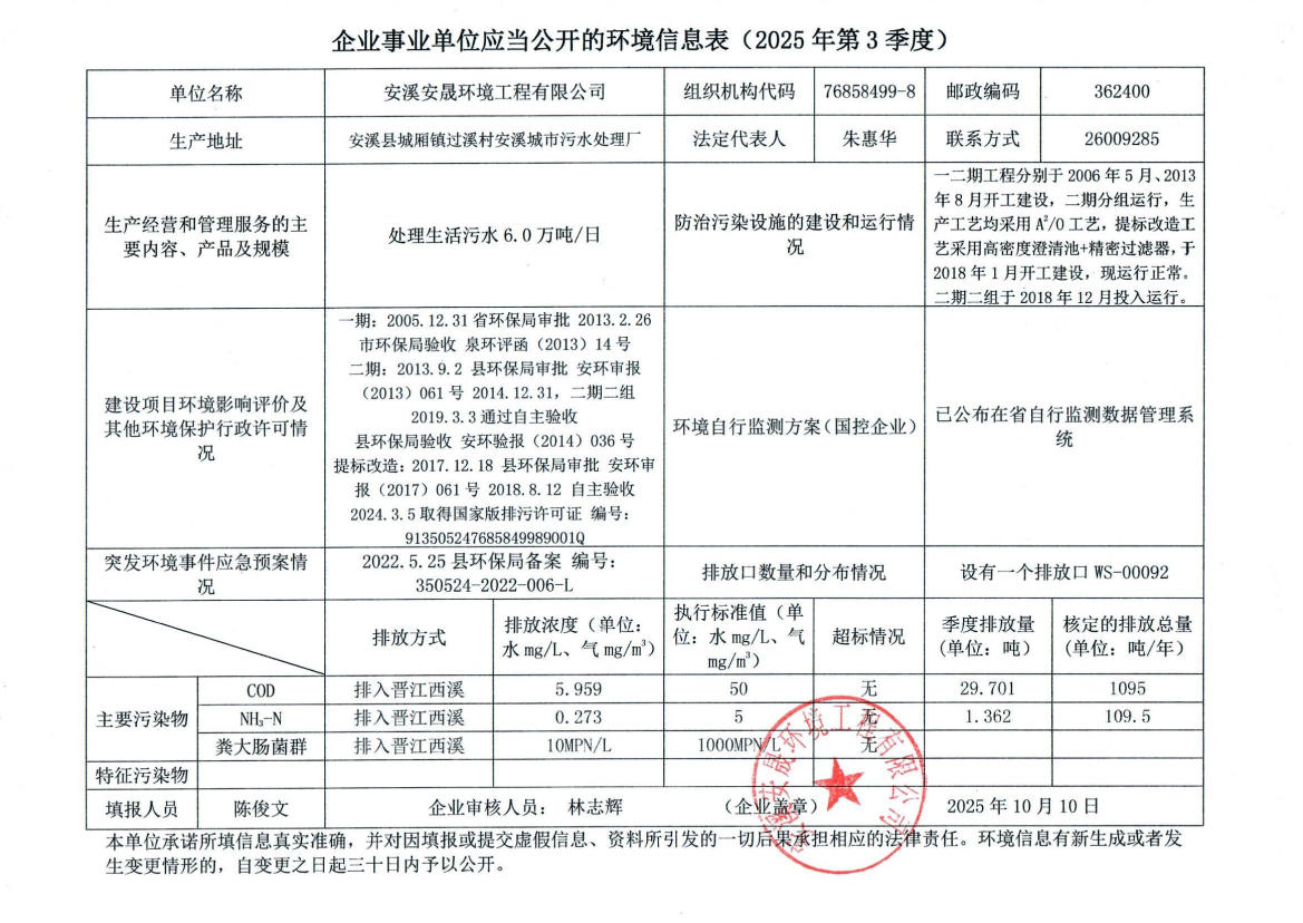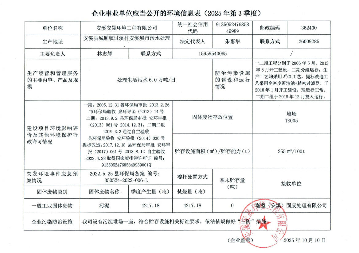 安溪城市污水处理厂2025年第3季度环境信息公开